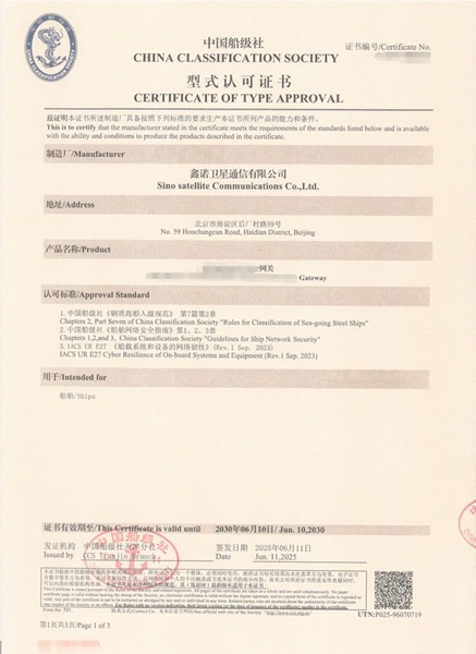 鑫諾衛(wèi)星通信有限公司自主研發(fā)網(wǎng)關(guān)產(chǎn)品獲中國(guó)船級(jí)社型式認(rèn)可證書(shū)